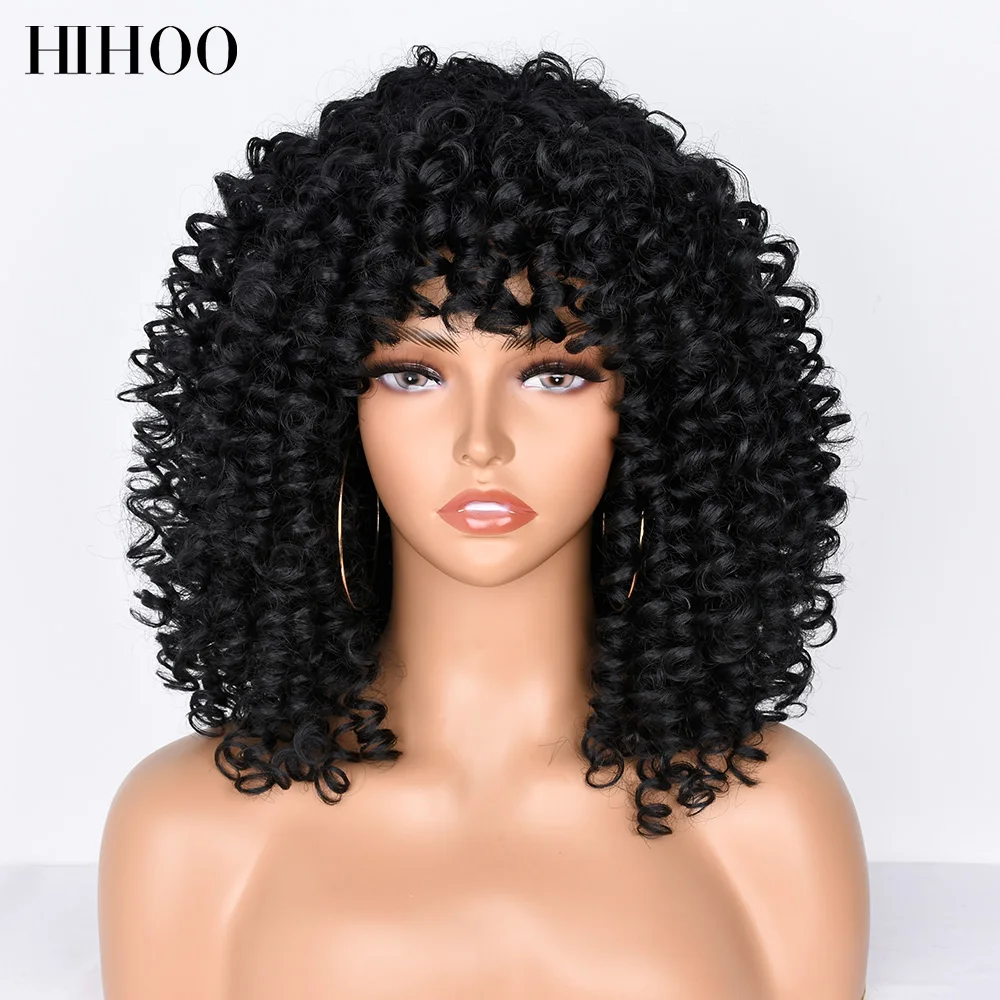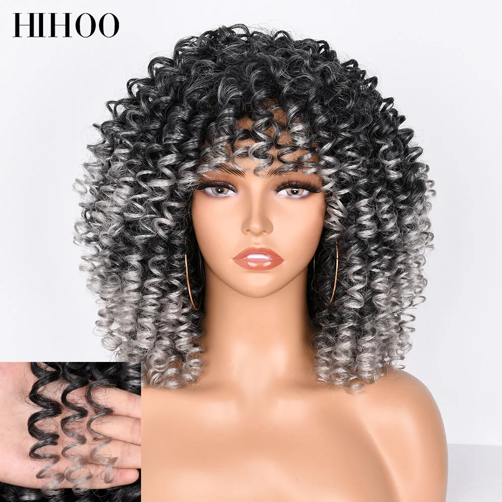 Short Hair Afro Kinky Curly Wigs With Bangs For Black Women Synthetic Wig Omber Glueless Cosplay Lolita Wig High Temperature