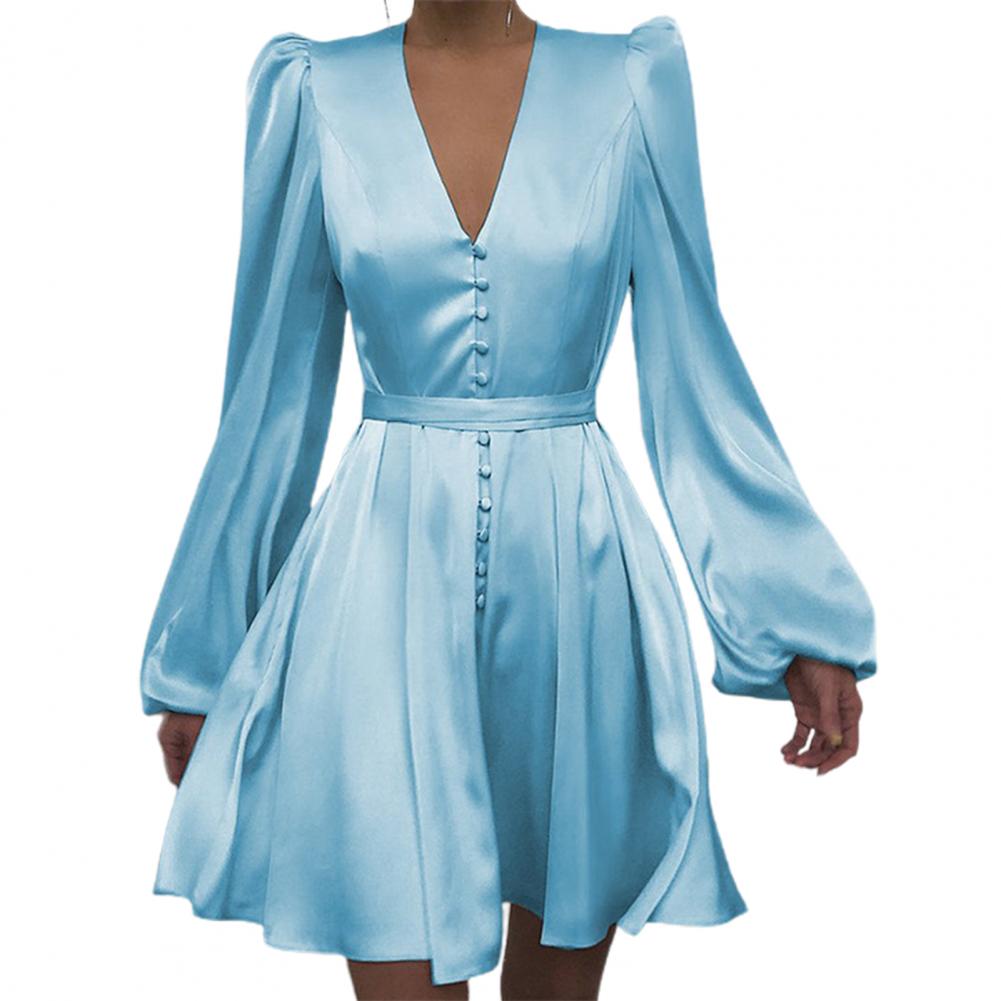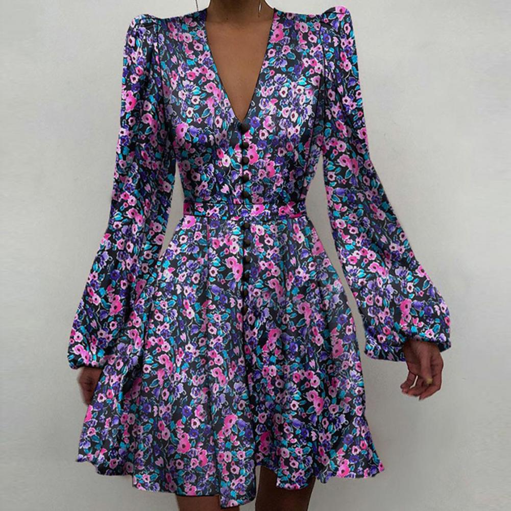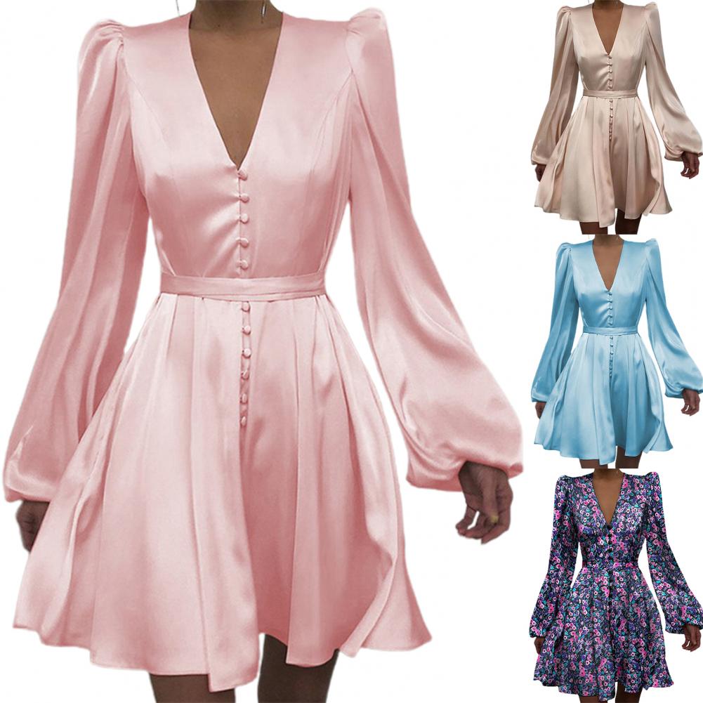 2021 Sexy Women Dress Right Shoulder Mini Sexy Full Dress Soft Solid Color Deep V Neck Print Lantern Sleeve Vintage Dress for Da