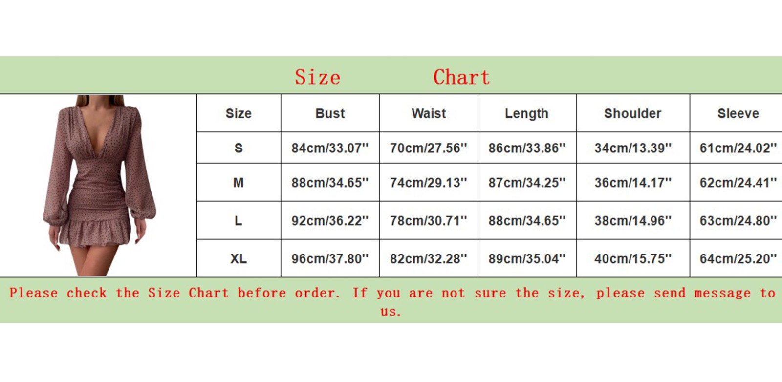 Size:L | Bust:92cm/36.22'' | Waist:78cm/30.71'' | Length:88cm/34.65'' | Shoulder:38cm/14.96'' | Sleeve:63cm/24.80'' |